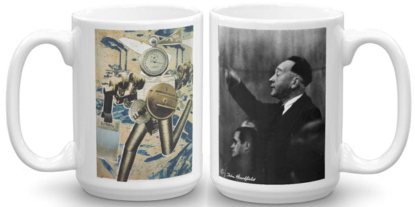 This robot art mug is beautiful, durable, and inspiring. The John Heartfield art is printed in full color on this white glossy mug. “Rationalization Is On The March” is Heartfield's vision of corporate rationalization for replacing workers in so many jobs. Corporate rationalization won't food on the table. View John Heartfield's work and modern political artists on The John Heartfield Exhibition.